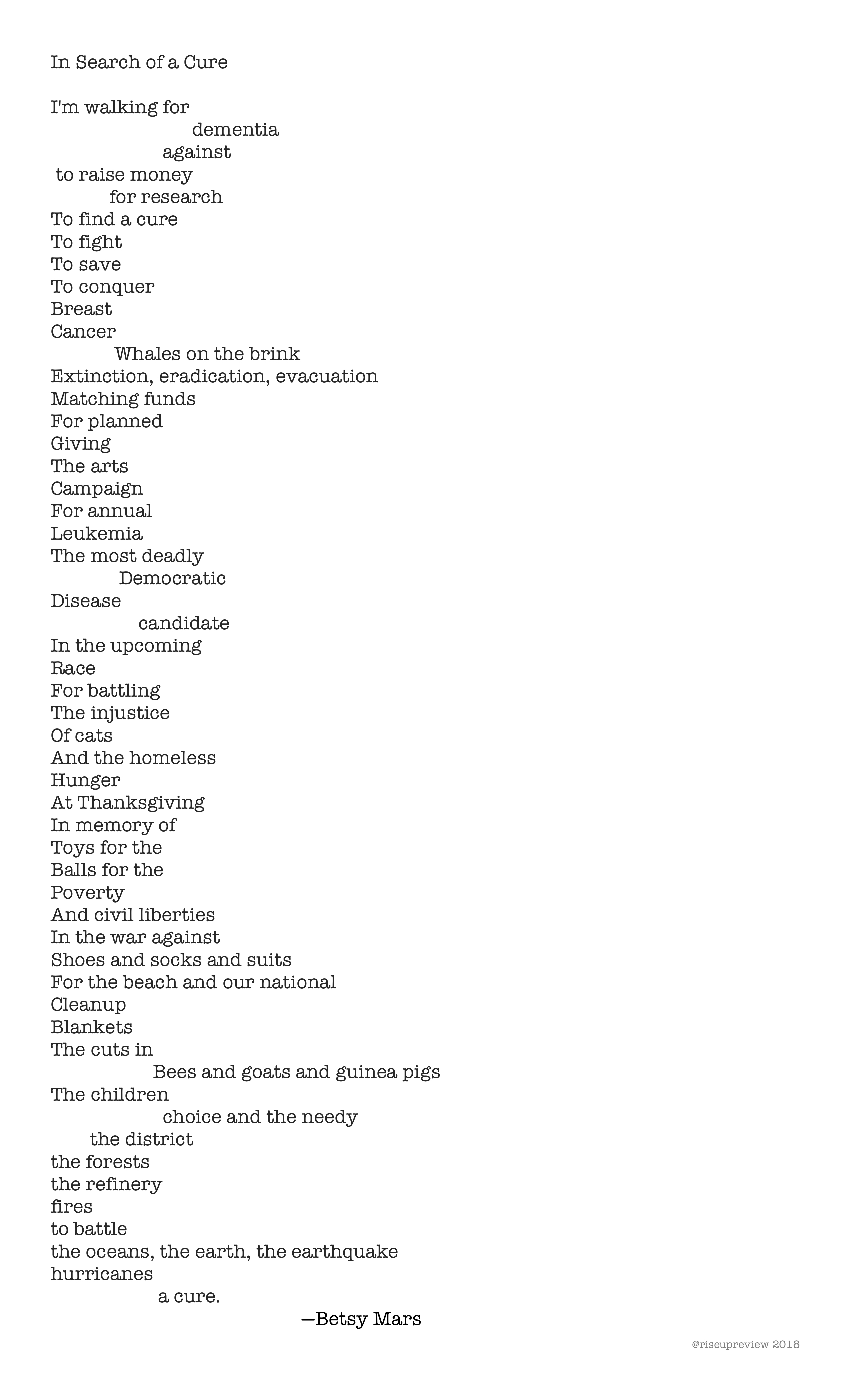Betsy Mars is a longtime resident of Southern California. She was born in Connecticut and her father's academic career led to several moves during her childhood, including two years in Brazil. She has her bachelor's and master's degrees from USC, and currently is not using either in her work as a substitute teacher. She is a poet, mother, animal lover, and travel fanatic who is struggling to remain optimistic. Her work has appeared in The Ekphrastic Review, Sheila-Na-Gig, and Writing In A Woman's Voice. Upcoming publications include the Peacock Journal and the California Quarterly. Please visit her at https://www.facebook.com/marsbitsandpieces/