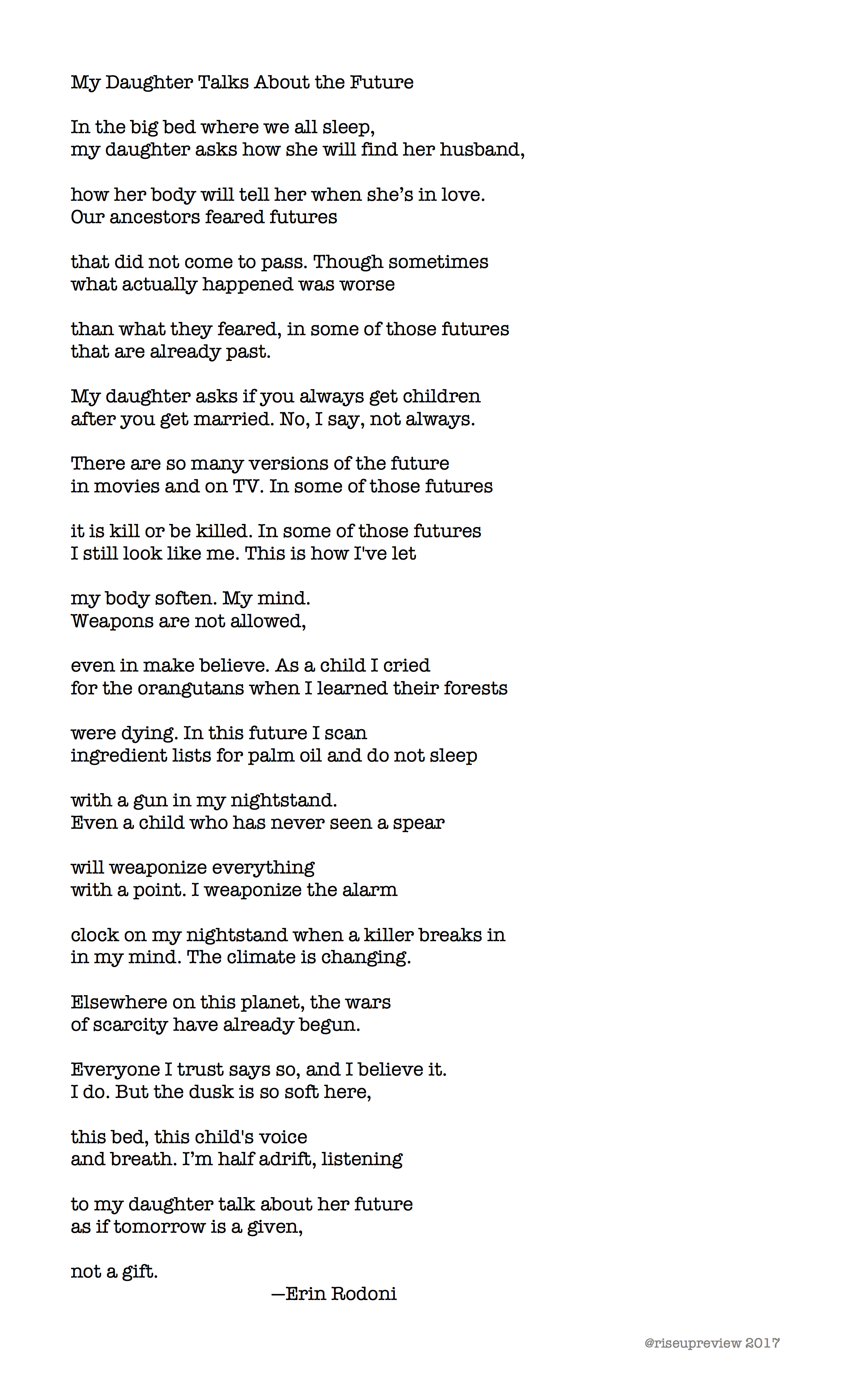 Erin Rodoni is the author of Body, in Good Light (Sixteen Rivers Press, 2017) and A Landscape for Loss (NFSPS Press, 2017), which won the 2016 Stevens Award sponsored by the National Federation of State Poetry Societies. Her poems have been included in Best New Poets 2014, nominated for Pushcart Prizes, and honored with awards from AWP and Ninth Letter. She lives in the San Rafael, CA, with her husband and two young daughters.